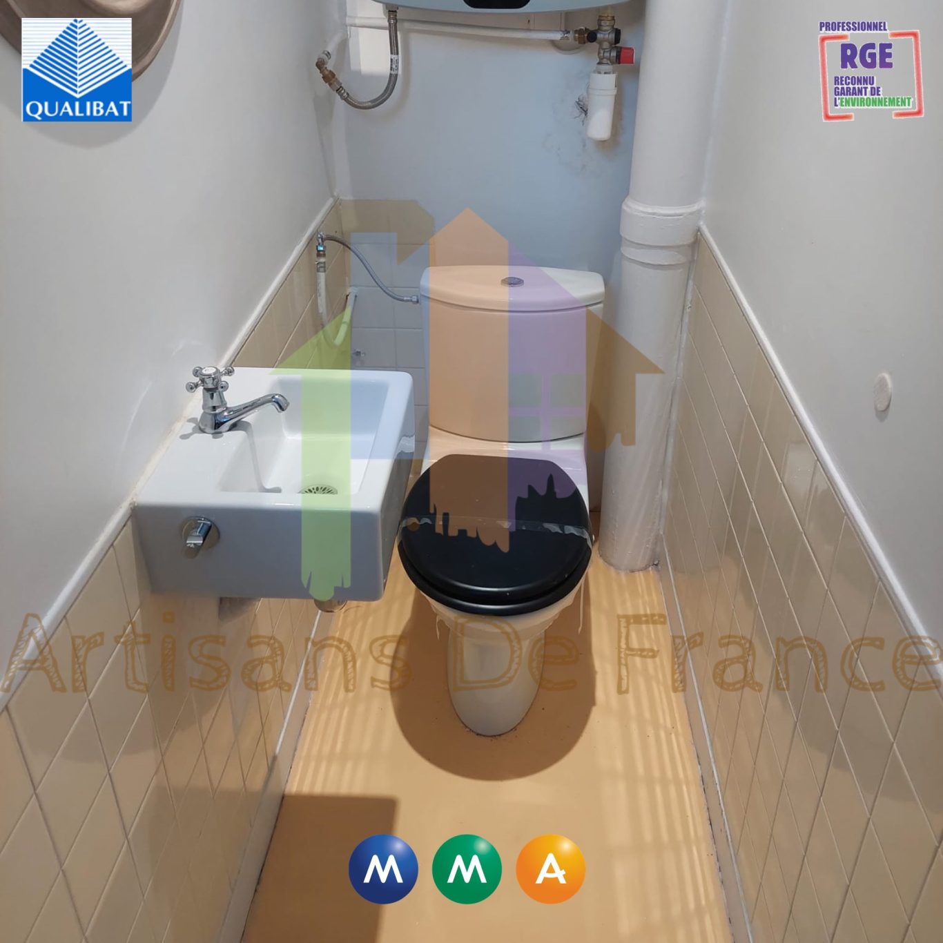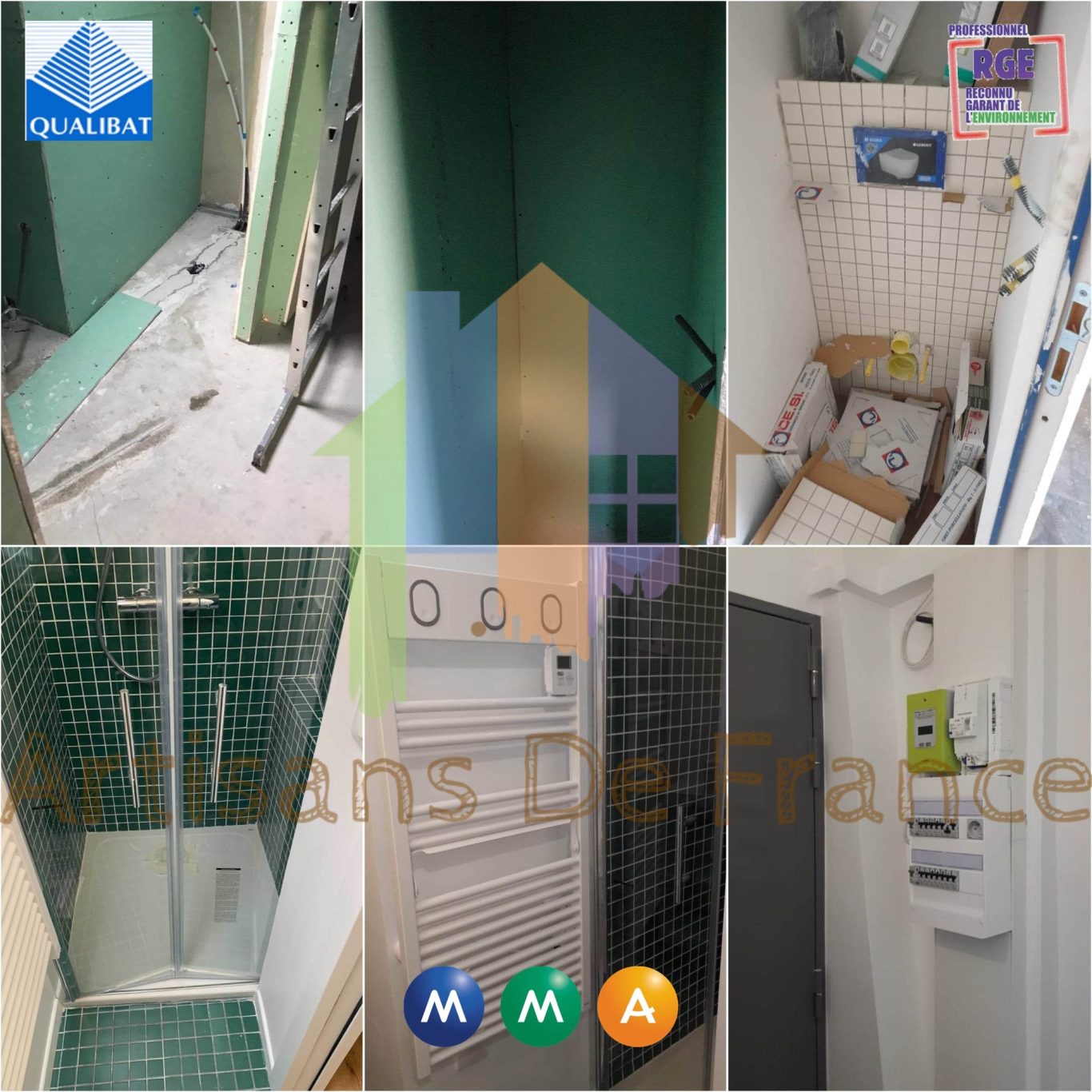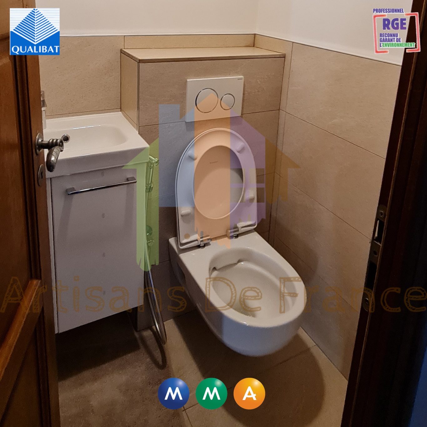 Nous avons agrandi la douche, isolé le pan de mur qui donne sur l'extérieur, refais la faïence et remplacé le sol par un parquet en bois massif teck, le bois utilisé pour les bateau donc résiste à l'eau. Le toilette sur pied a été remplacé un toilette suspendu Geberit avec un meuble WC en MDF créé par nos soins et un meuble vasque sur mesure en chaine massif pour contenir la machine à laver.
