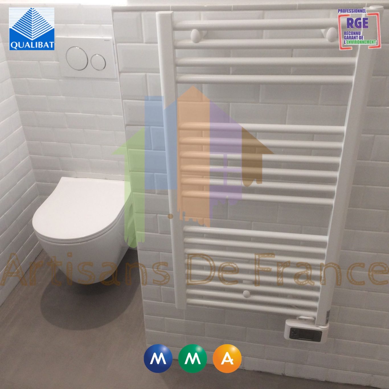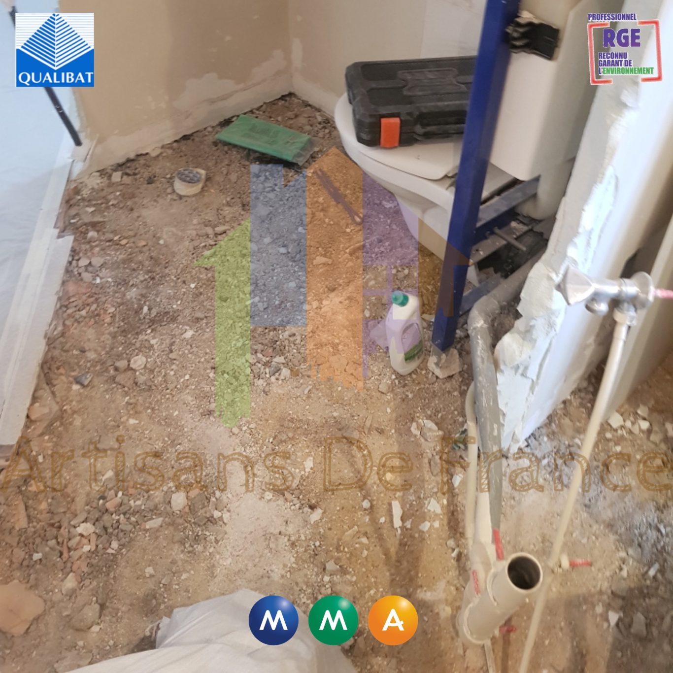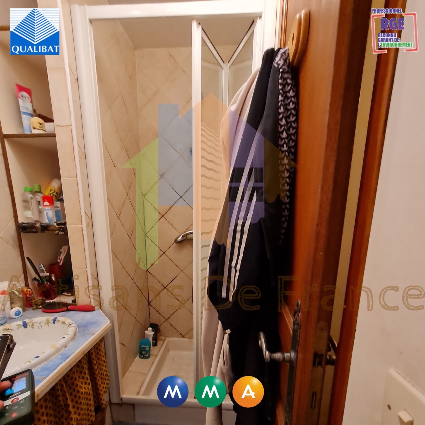 Nous avons agrandi la douche, isolé le pan de mur qui donne sur l'extérieur, refais la faïence et remplacé le sol par un parquet en bois massif teck, le bois utilisé pour les bateau donc résiste à l'eau. Le toilette sur pied a été remplacé un toilette suspendu Geberit avec un meuble WC en MDF créé par nos soins et un meuble vasque sur mesure en chaine massif pour contenir la machine à laver.