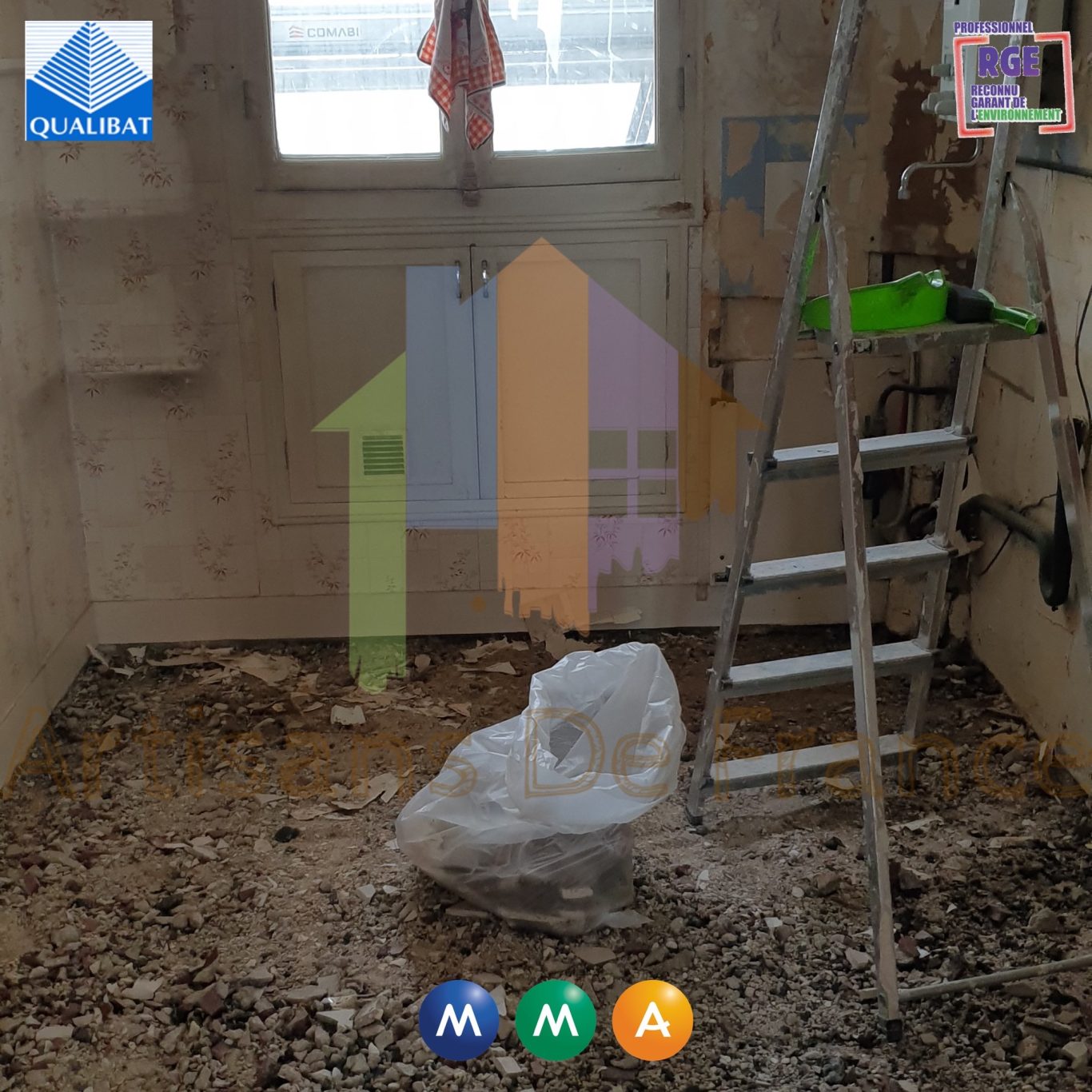 Se situant en fond de cour, l'appartement bénéficie de peu d'exposition, nous avons isolé les murs donnant sur l'extérieur, mis au normes l'électricité et les menuiserie extérieurs ont étaient changées. Nous avons posé une VMR hygroréglable pour combler les problèmes d'humidité dans les pièces d'eau.