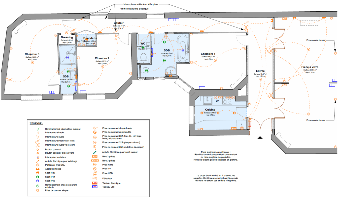 Une fois votre projet d’aménagement arrêté, nous vous proposons tous les éléments techniques qui seront utilisés lors des travaux de rénovation : dossiers de plan d’implantation côté, coupes, élévations, plan électrique.