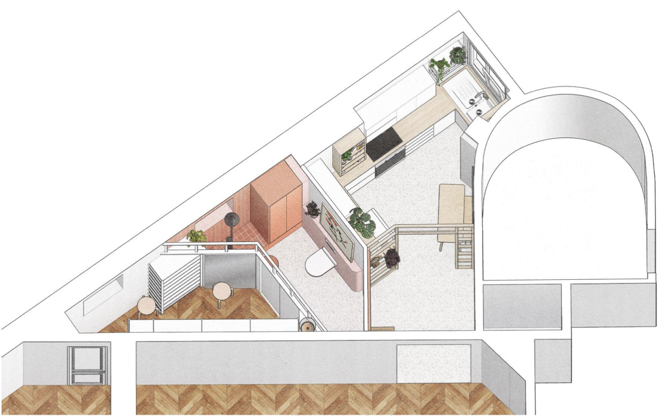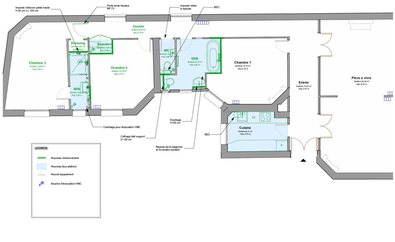 Nous avons modifier l'emplacement de la cuisine afin de gagner en espace, réorganisé la salle de bain pour gagner deux espaces de rangement.