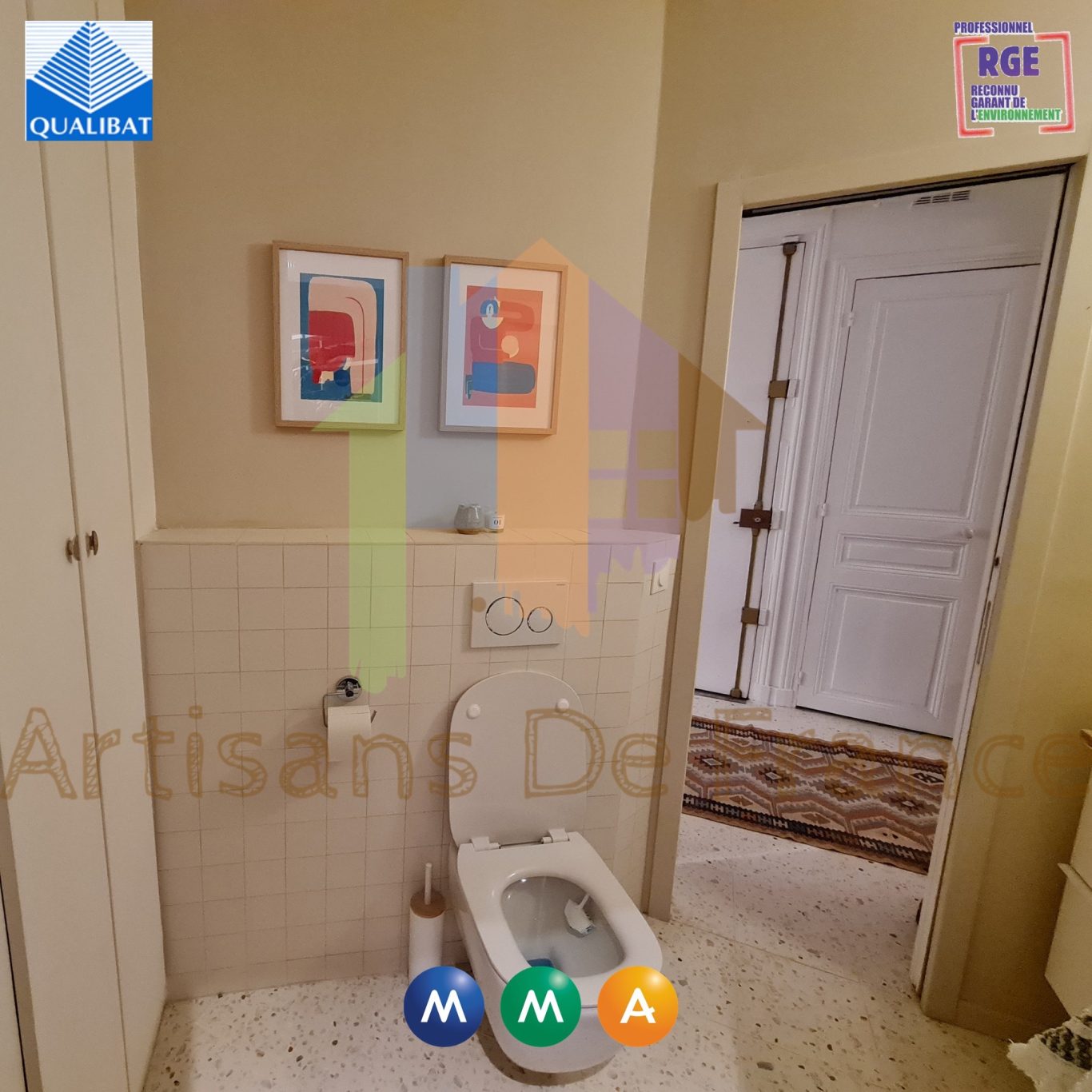 Notre cliente a racheté le local vélo, nous avons créé une ouverture sur l'appartement et condamné l'entrée principale. Nous l'avons transformé en salle de bain sur laquelle nous avons ouvert le toilette.